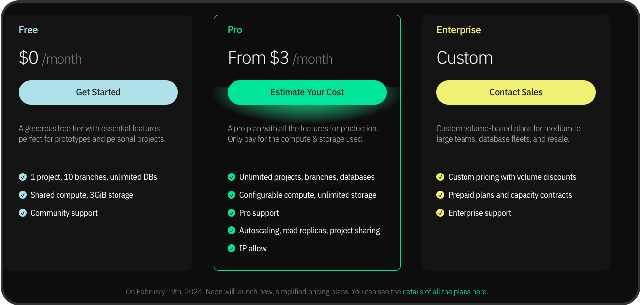 If you use on Neon cloud, you can use it for free with unlimited dbs and 3GiB of storage. You can also build the project from its GitHub repository for unlimited and free use. If you want to try it on the cloud for a hassle-free experience, it offers very reasonable prices starting at $3 per month, which is competitive compared to its rivals and traditional servers.